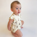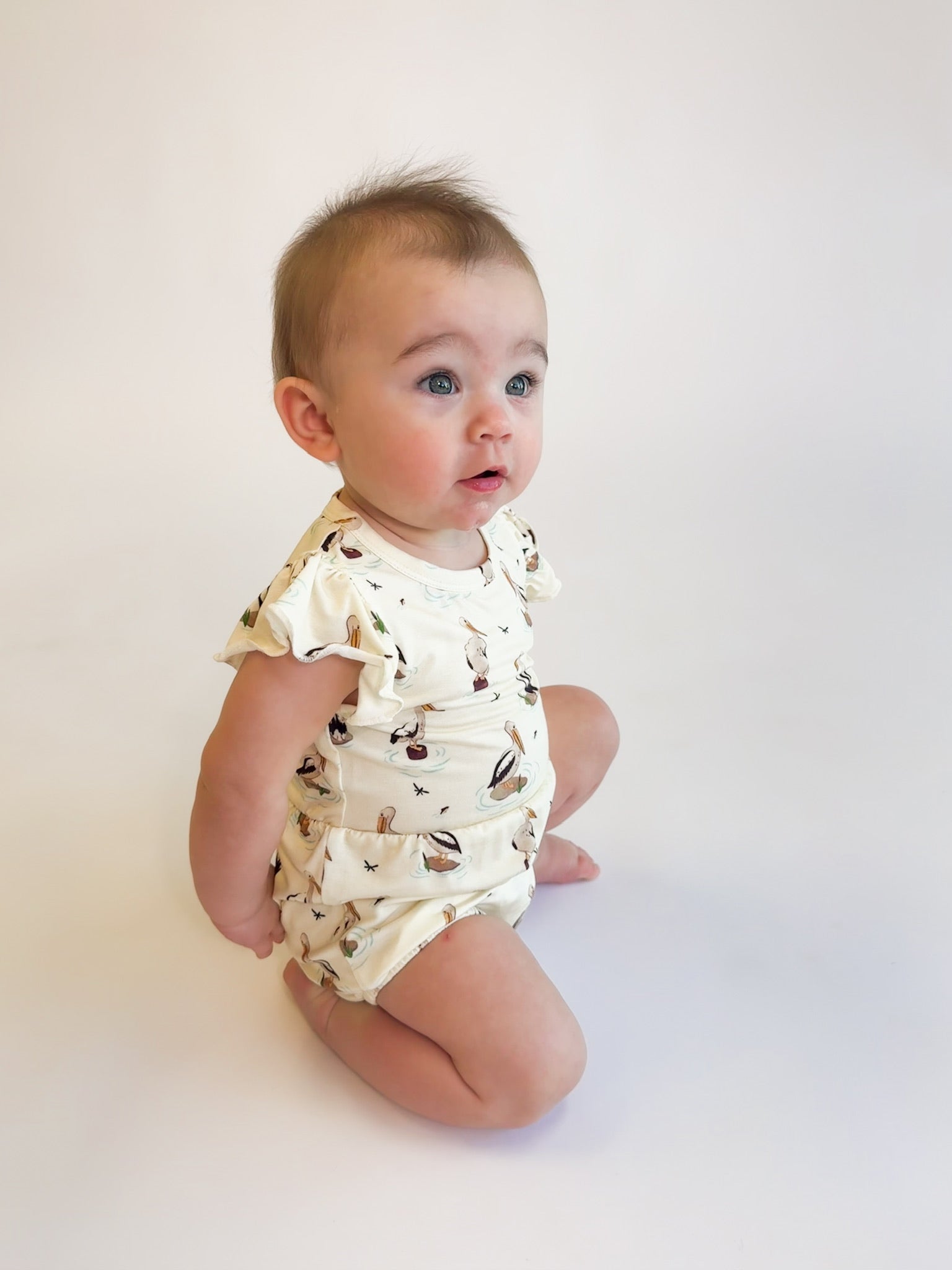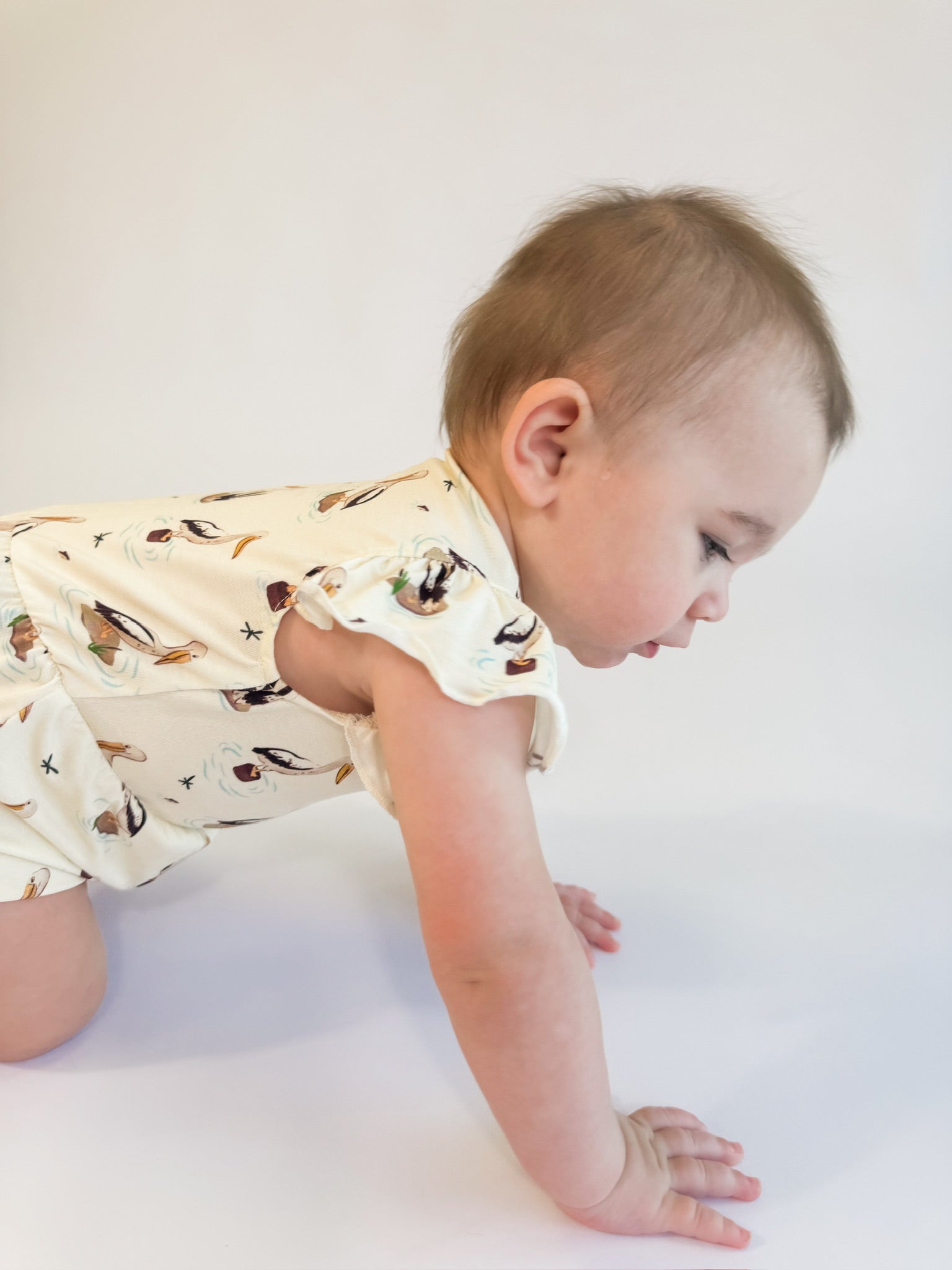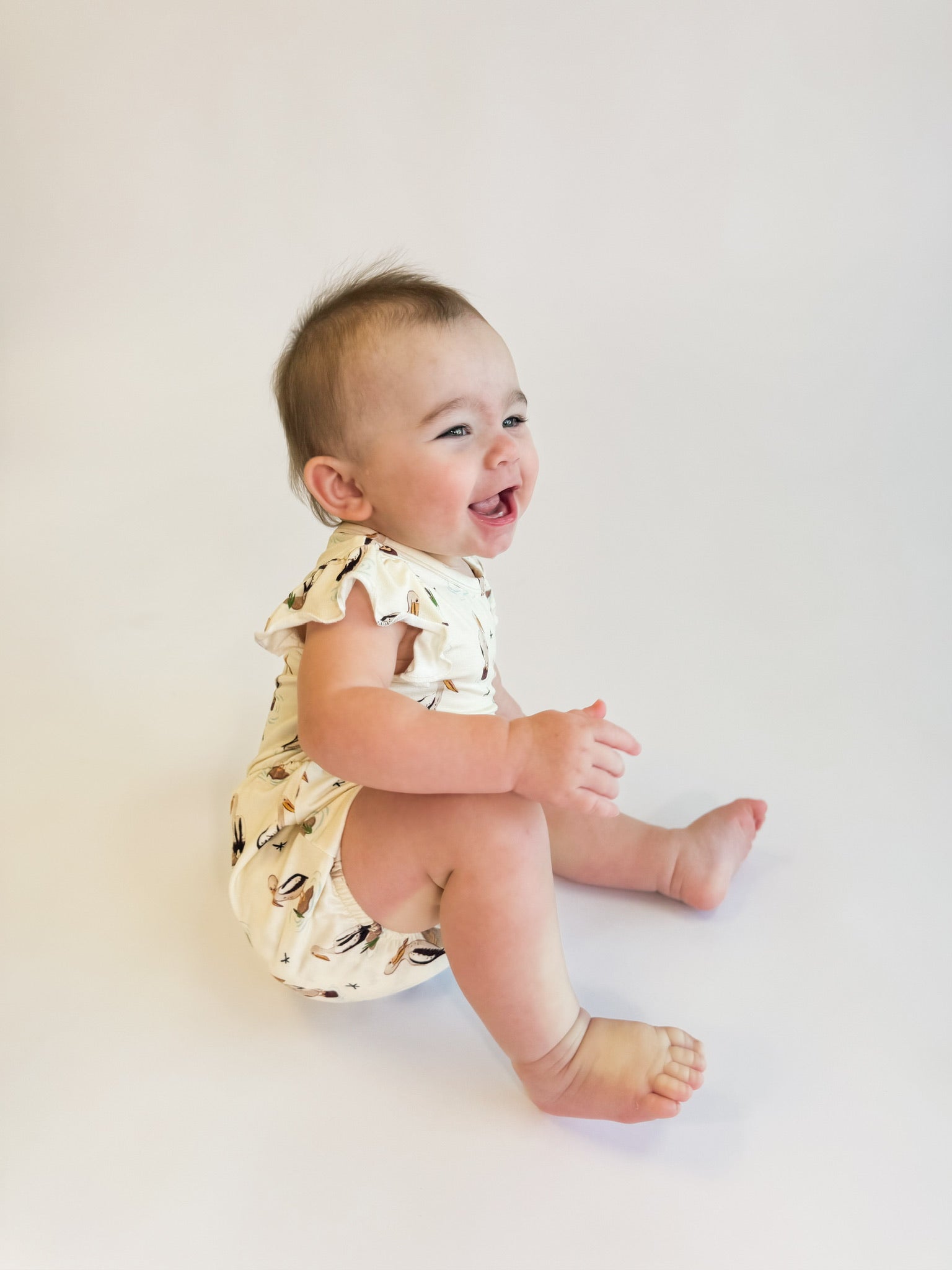 Soft, sweet, and made for sunshine days — our Flutter Bubble is the perfect one-piece for your little one’s first adventures. Designed with delicate flutter sleeves and gentle stretch, it keeps baby comfy while looking oh-so-darling.