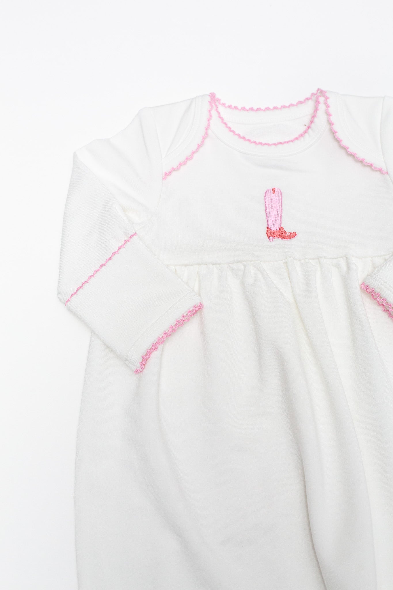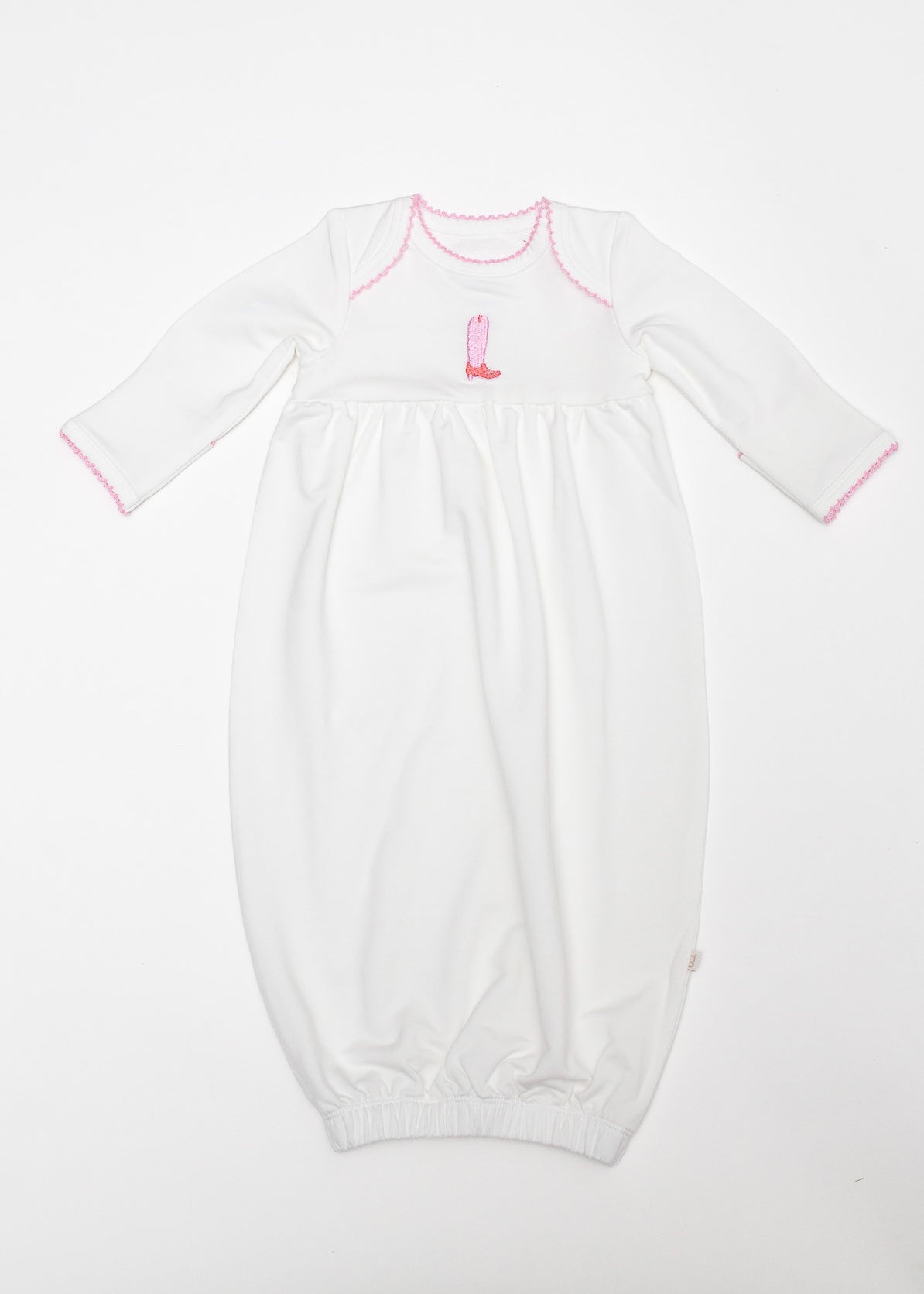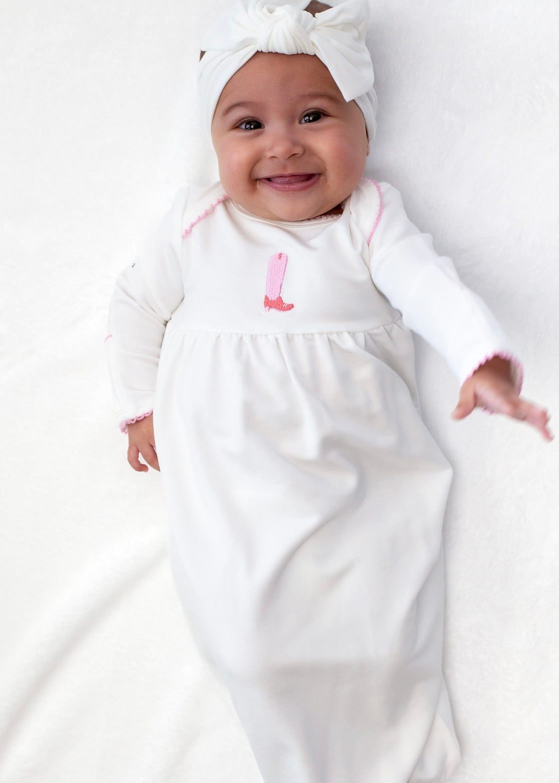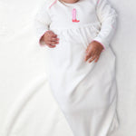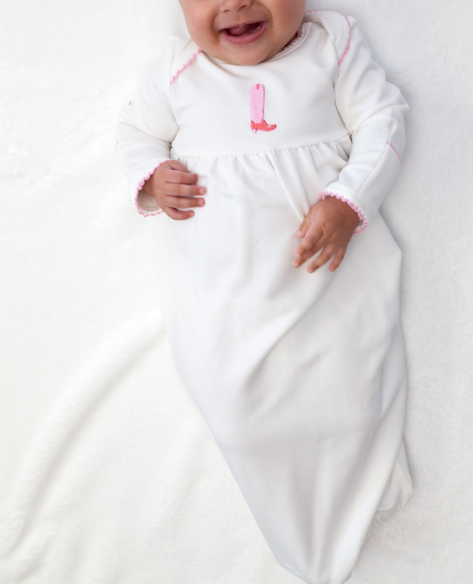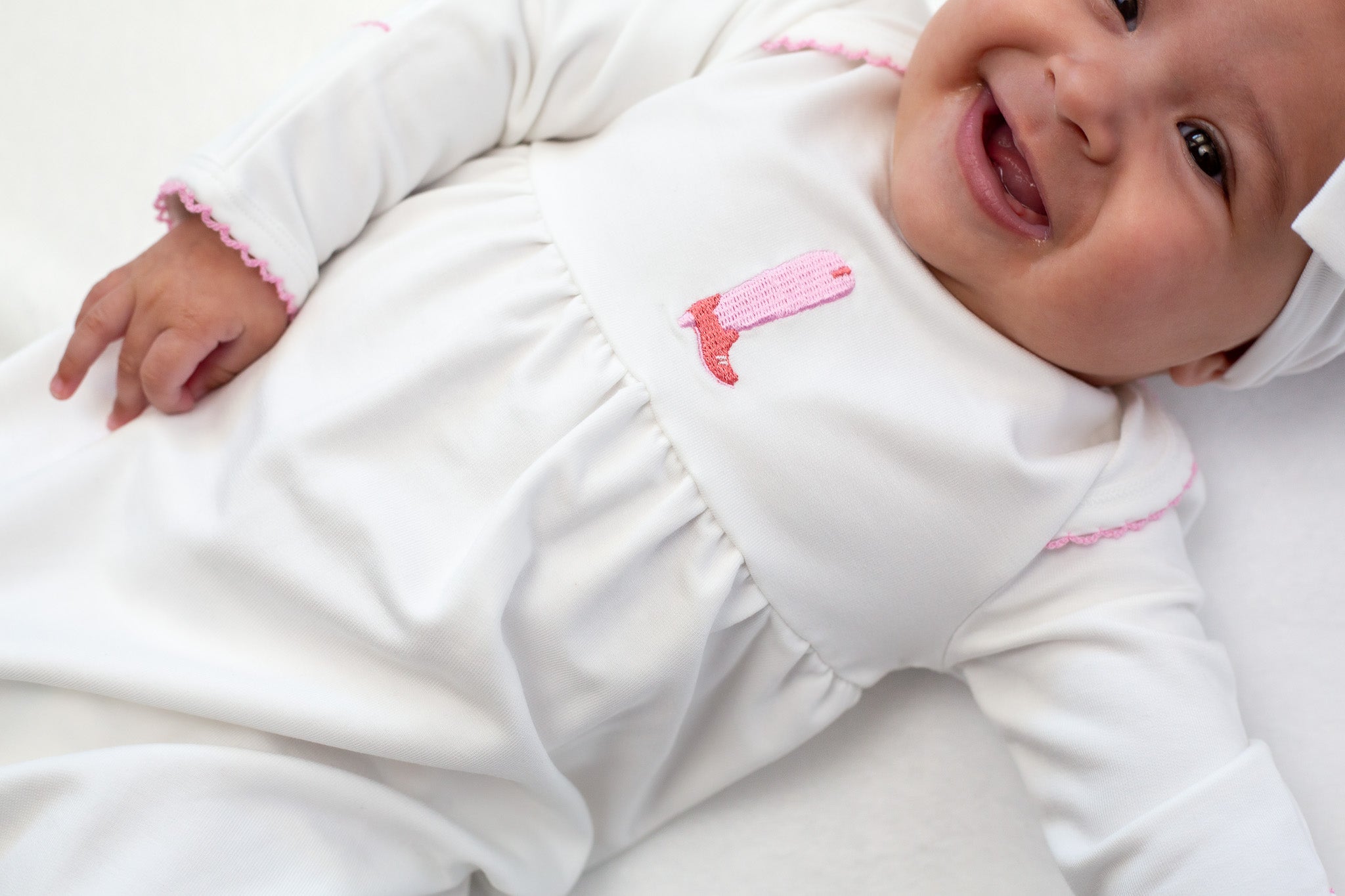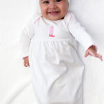 The gown features delicate picot trim along the neckline and scratch mitts for a subtle pop of color and timeless detail. Our exclusive embroidered icons add a playful, heirloom-inspired touch. The gathered yoke creates a relaxed, roomy fit, while the elasticized bottom allows for quick and easy diaper changes—perfect for busy parents and sleepy snuggles.