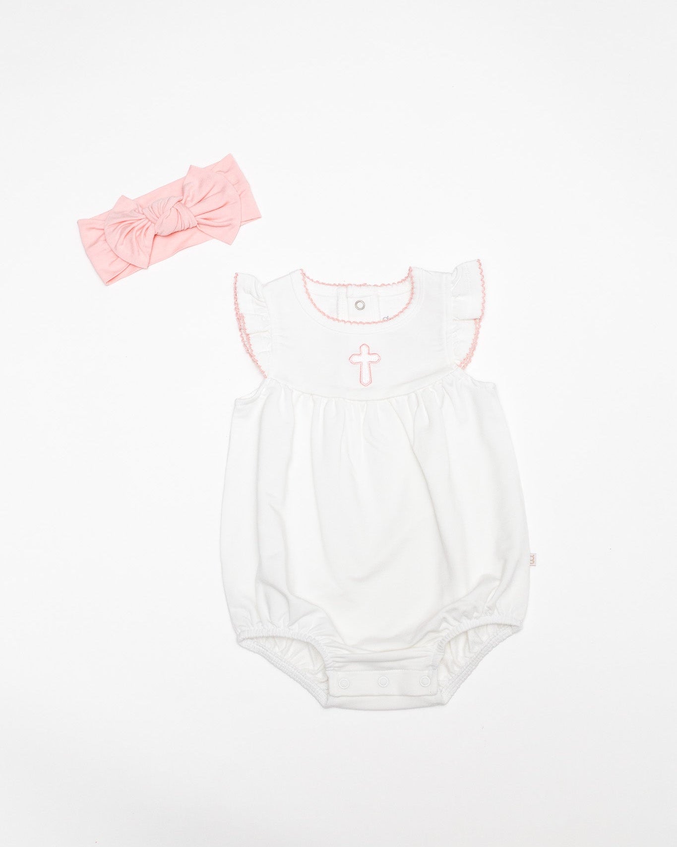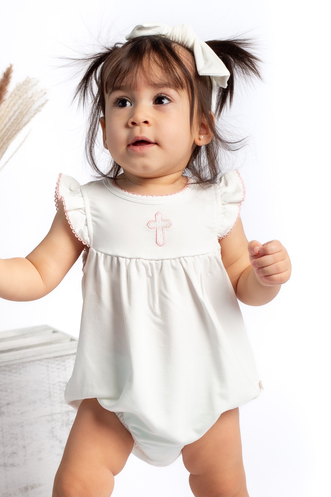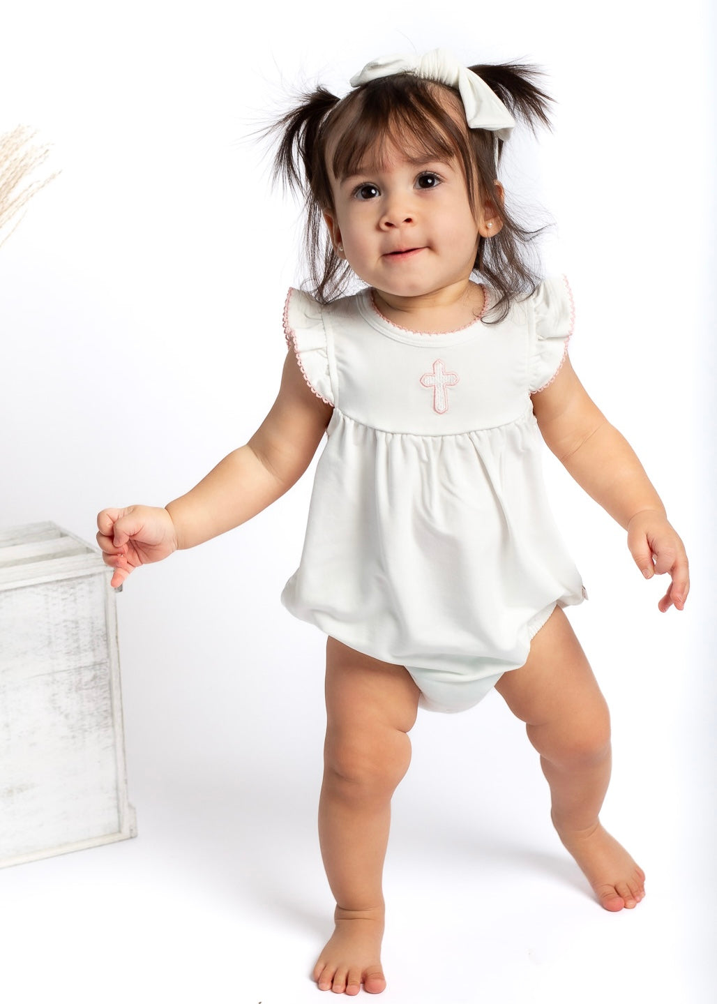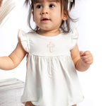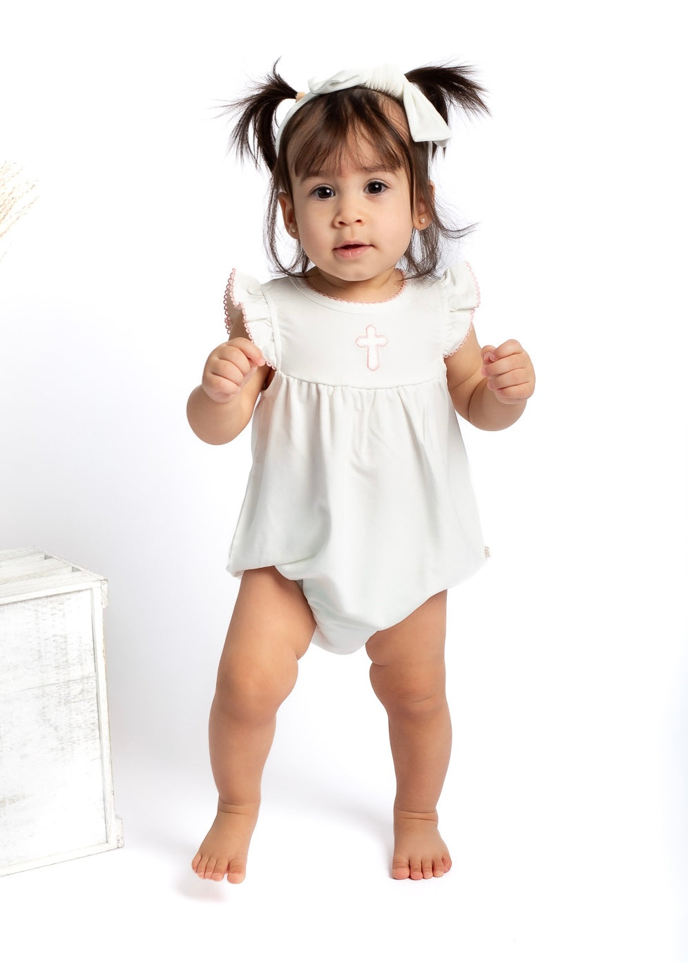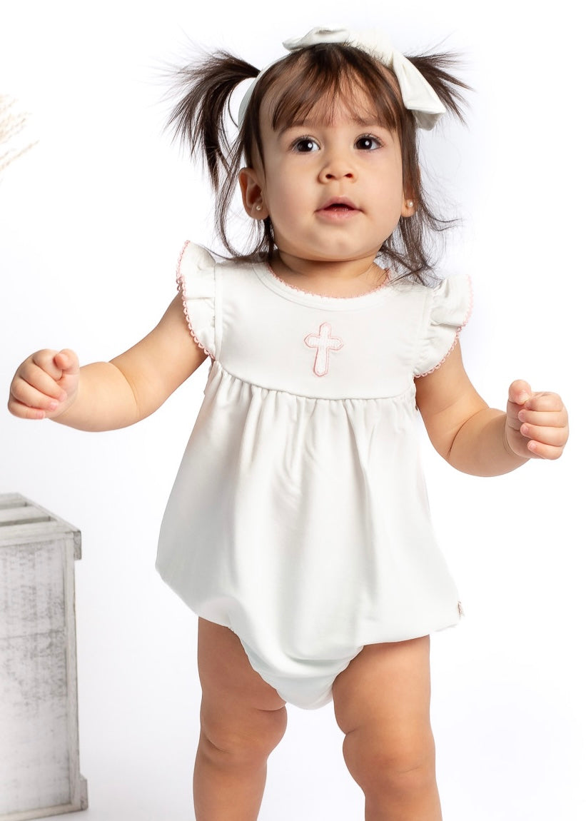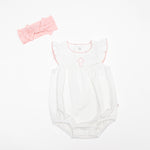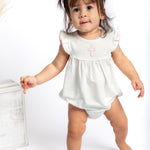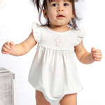 A timeless staple with the sweetest details 🤍 This crisp white bubble romper features a delicate embroidered icon at the chest, soft picot trim along the neckline and sleeves, and a gently gathered silhouette for an effortlessly classic look. Designed with comfort and ease in mind, it includes neck snaps and bottom snaps for quick changes.