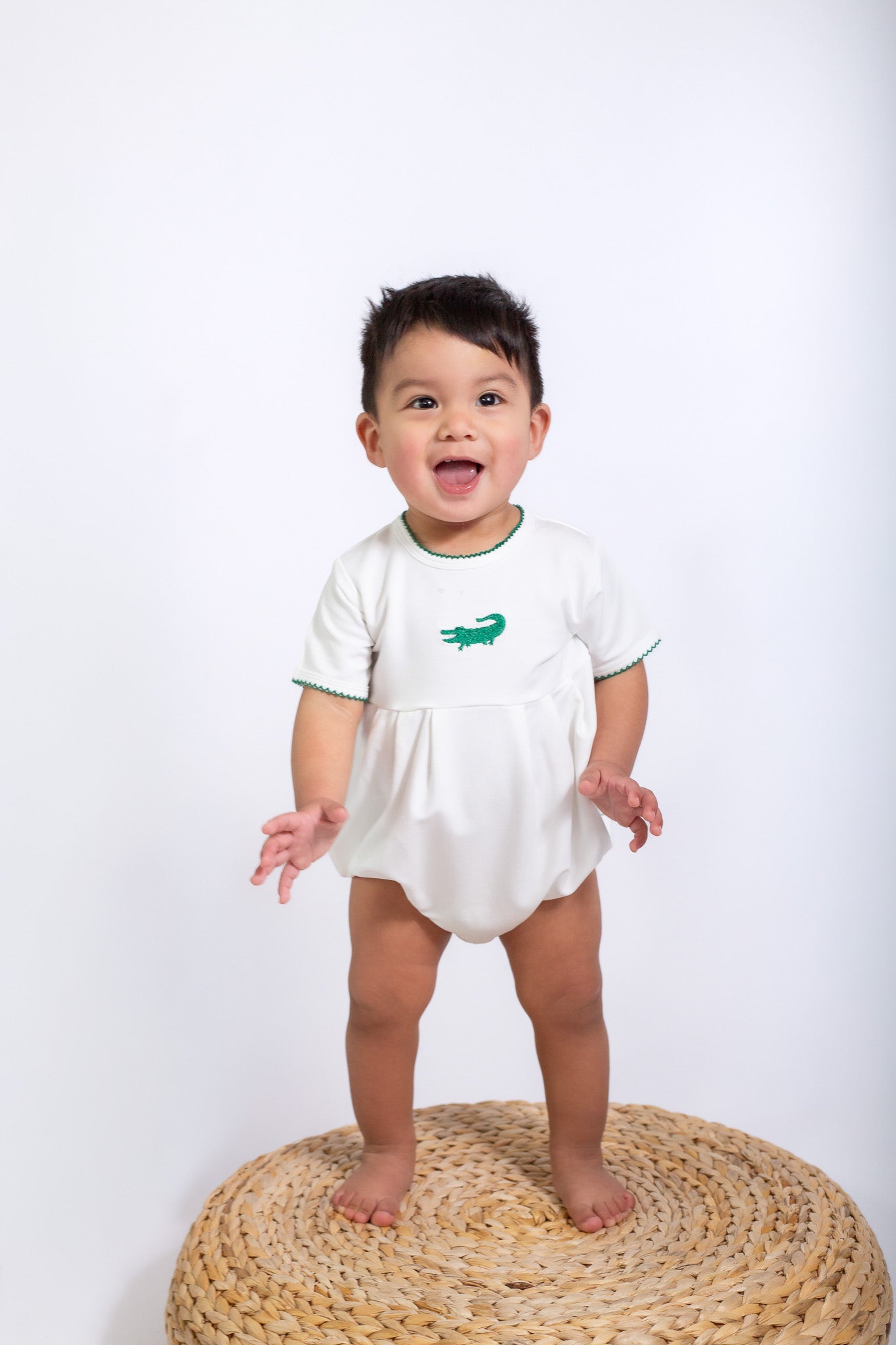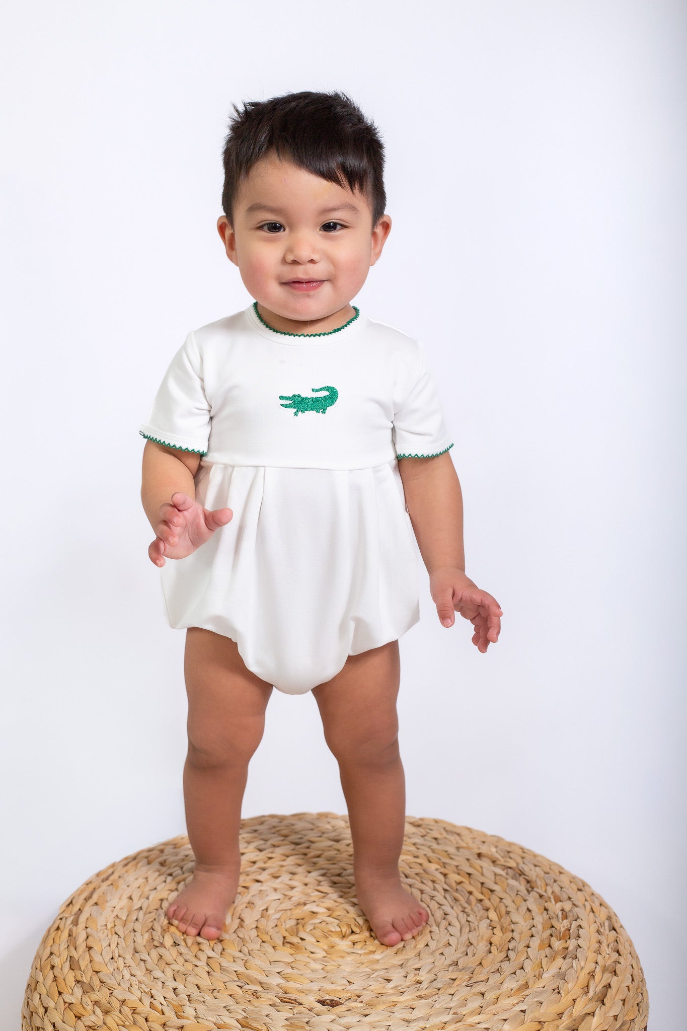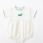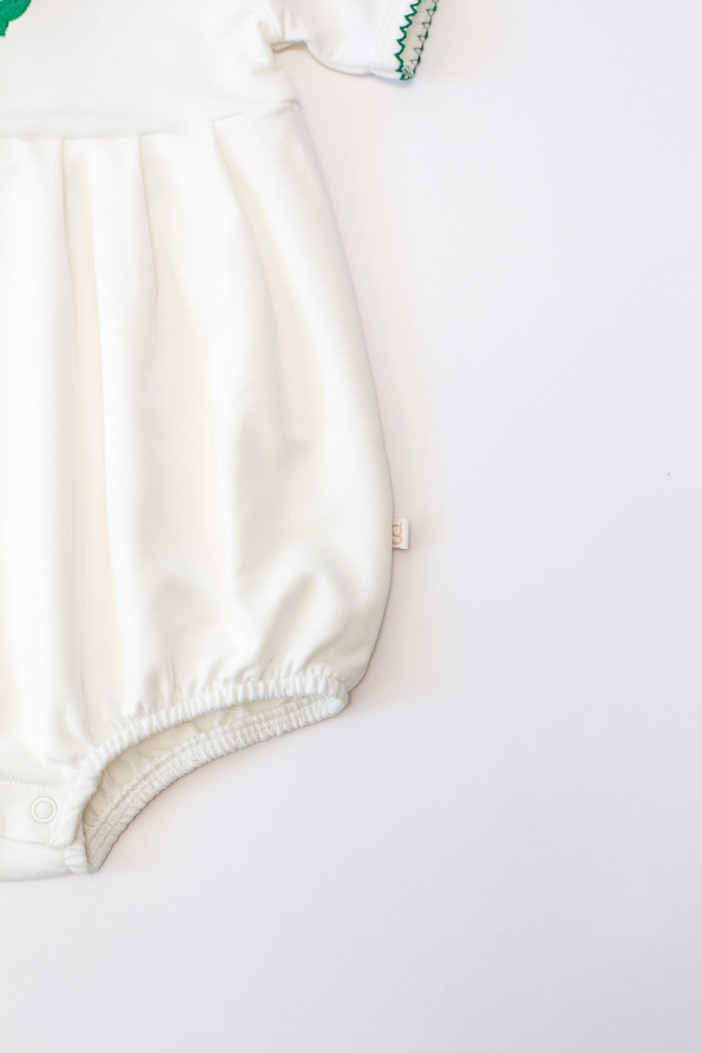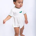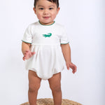 A timeless staple with the sweetest details 🤍 This crisp white bubble romper features a delicate embroidered icon at the chest, soft picot trim along the neckline and sleeves, and a gently gathered silhouette for an effortlessly classic look. Designed with comfort and ease in mind, it includes neck snaps and bottom snaps for quick changes.