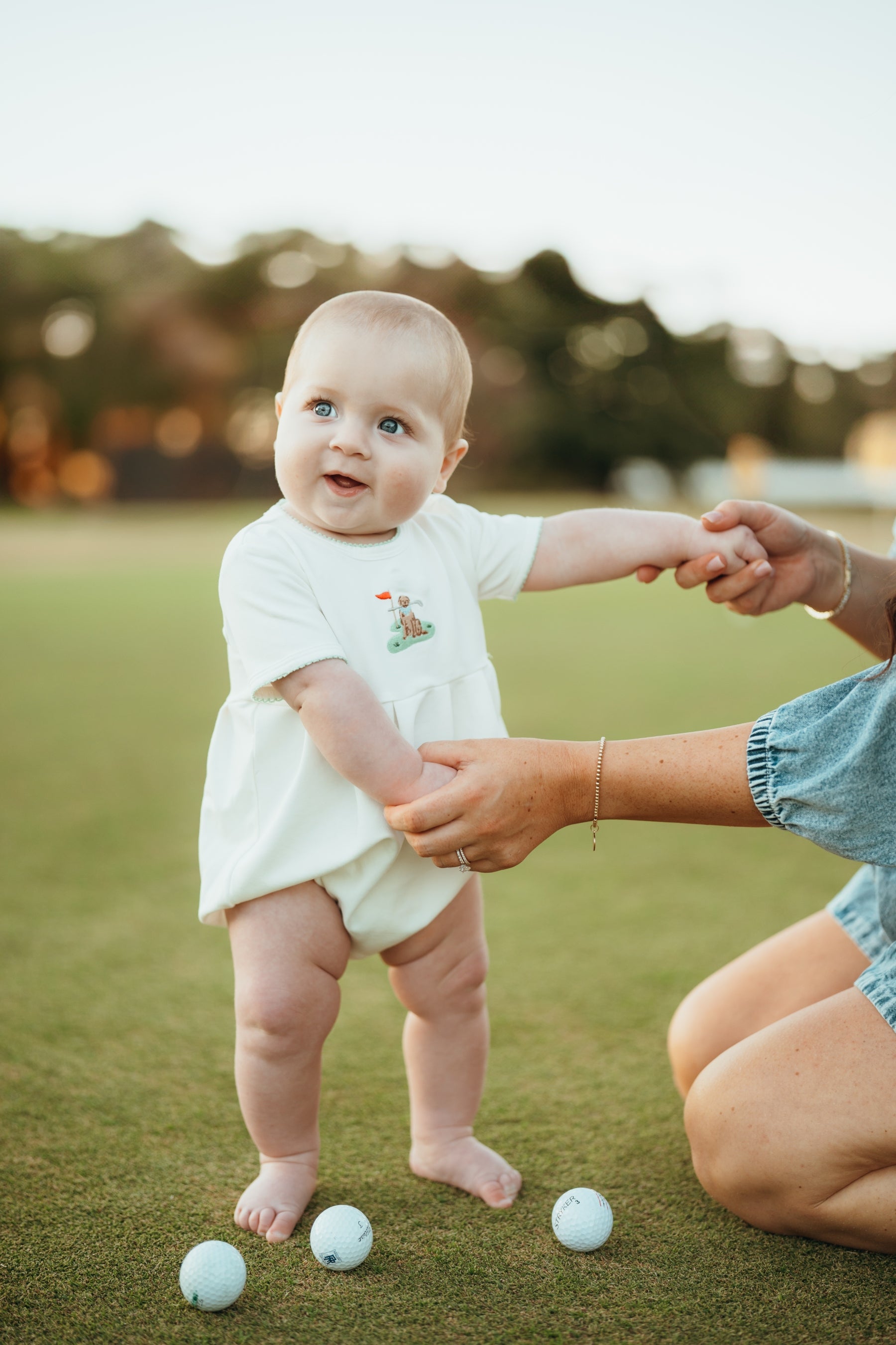 A timeless staple with the sweetest details 🤍 This crisp white bubble romper features a delicate embroidered icon at the chest, soft picot trim along the neckline and sleeves, and a gently gathered silhouette for an effortlessly classic look. Designed with comfort and ease in mind, it includes neck snaps and bottom snaps for quick changes.