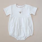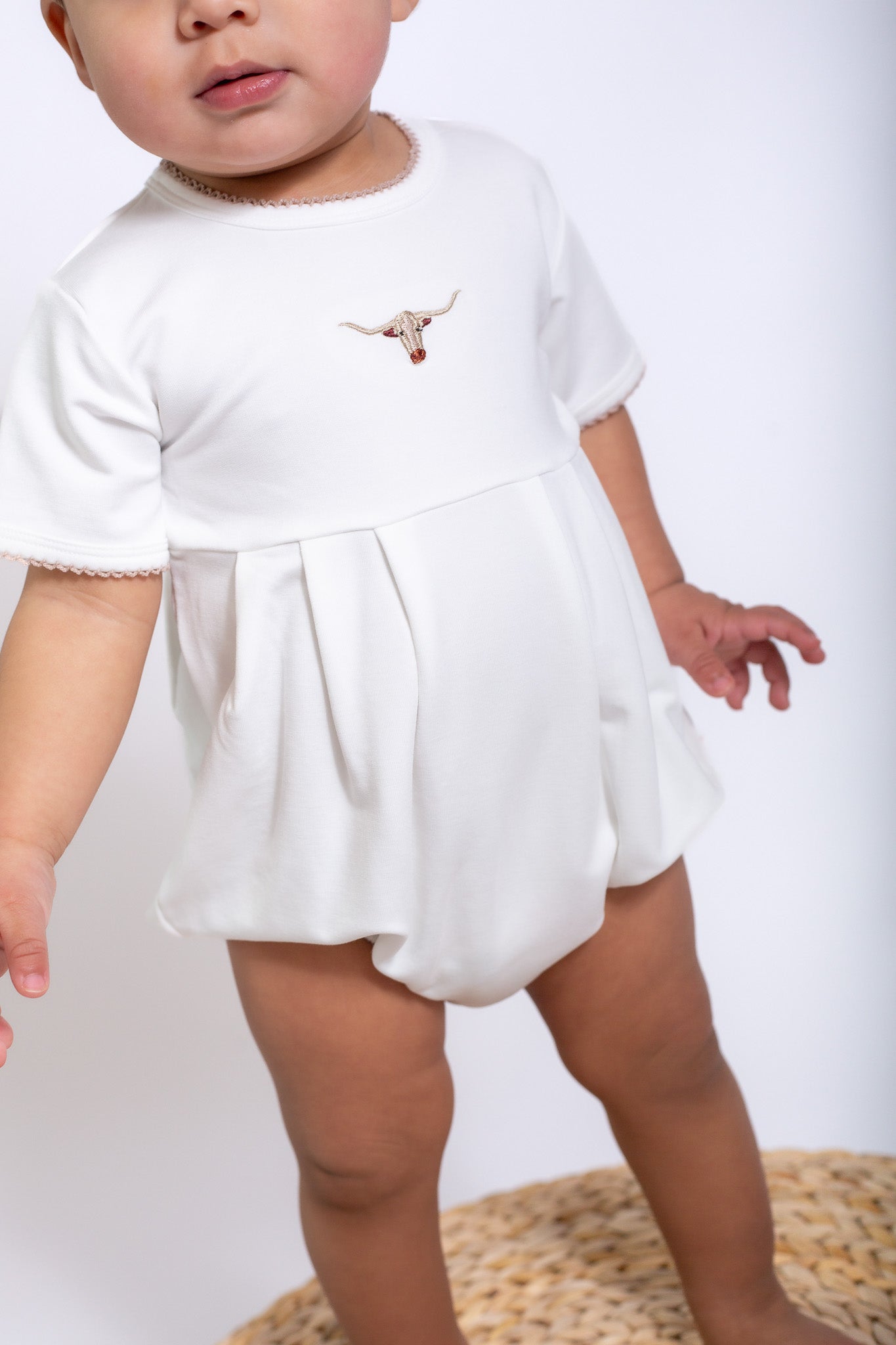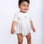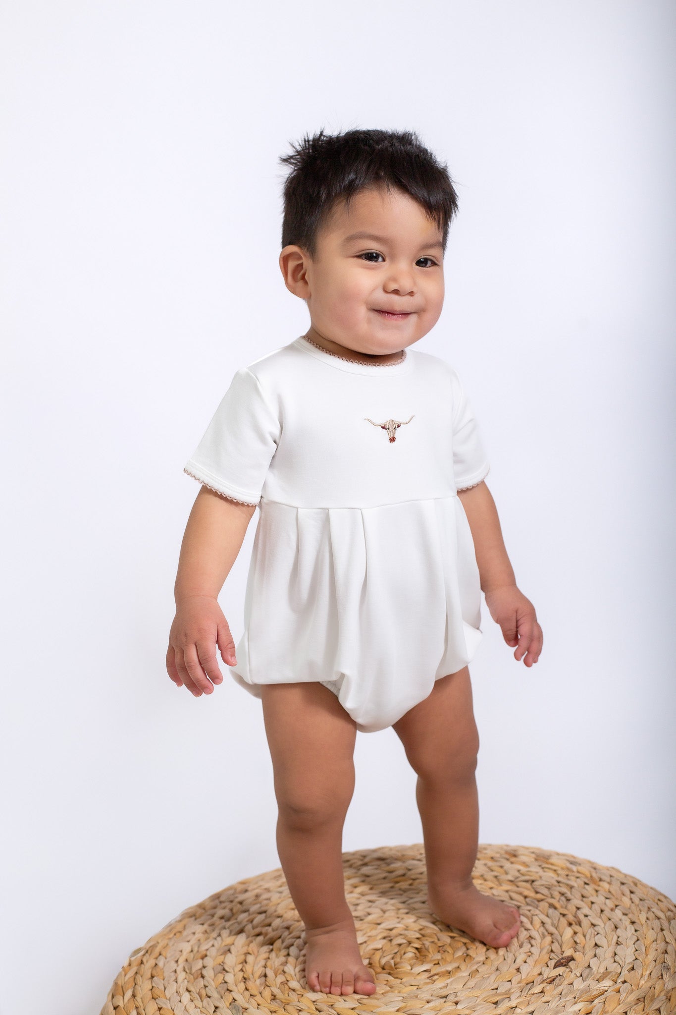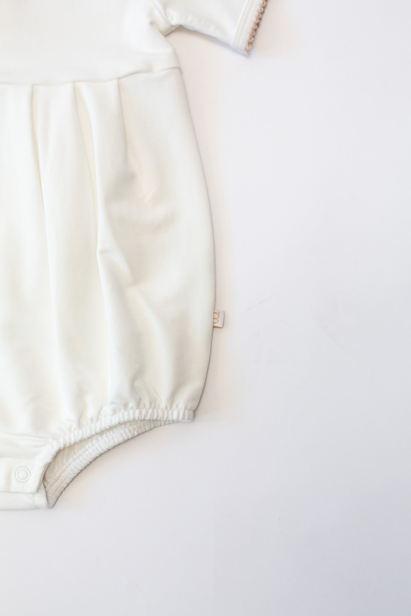 A timeless staple with the sweetest details 🤍 This crisp white bubble romper features a delicate embroidered icon at the chest, soft picot trim along the neckline and sleeves, and a gently gathered silhouette for an effortlessly classic look. Designed with comfort and ease in mind, it includes neck snaps and bottom snaps for quick changes.