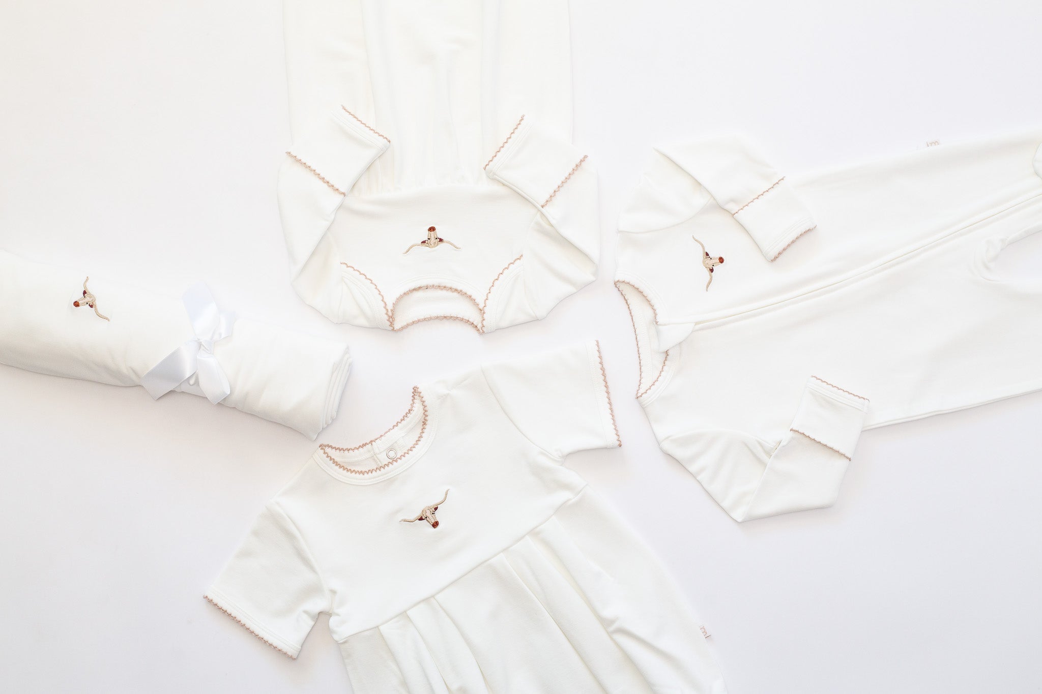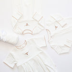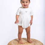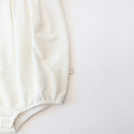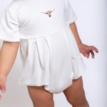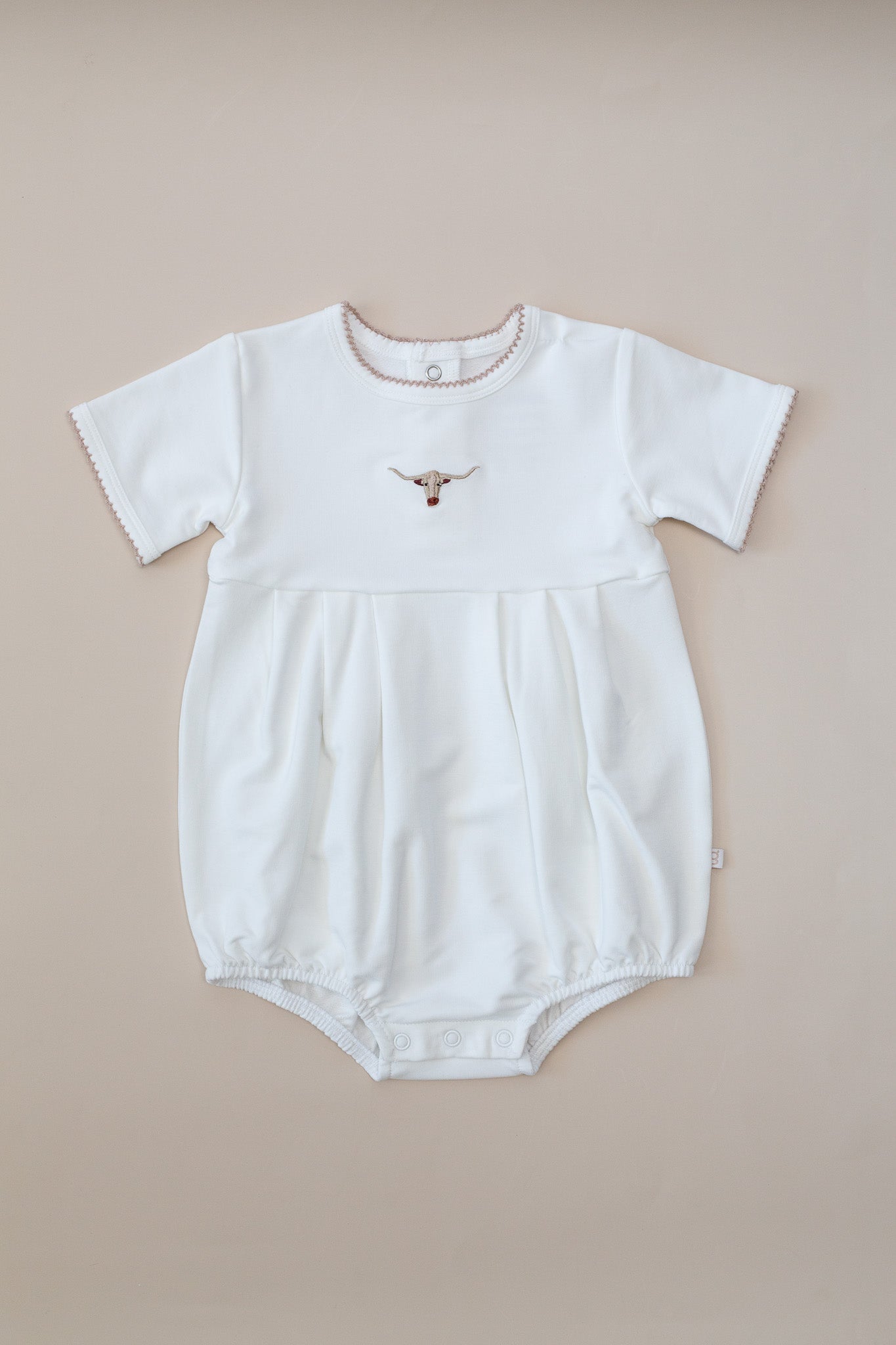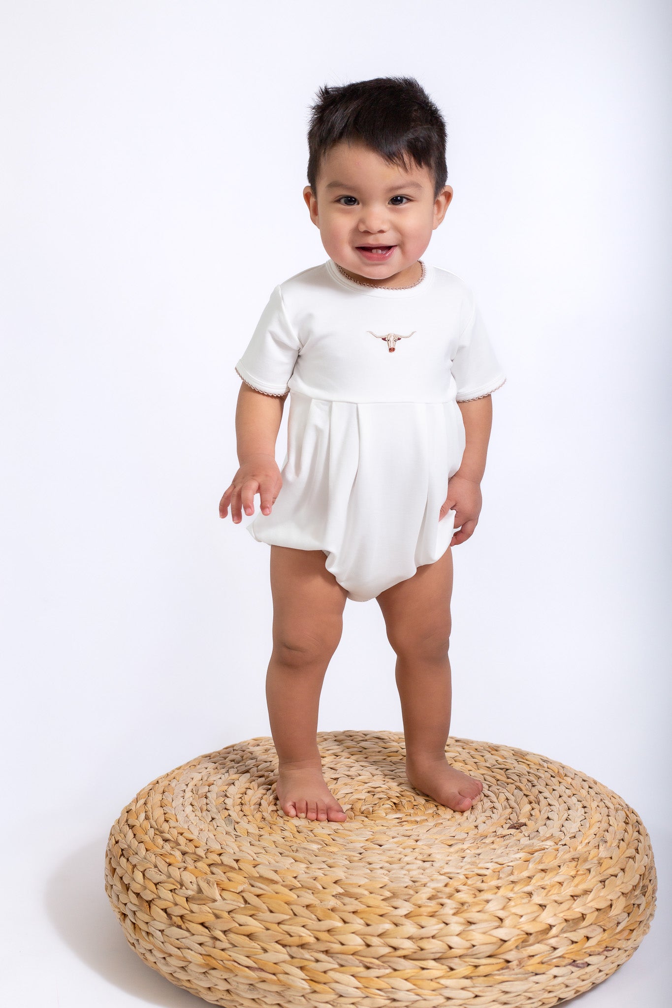 A timeless staple with the sweetest details 🤍 This crisp white bubble romper features a delicate embroidered icon at the chest, soft picot trim along the neckline and sleeves, and a gently gathered silhouette for an effortlessly classic look. Designed with comfort and ease in mind, it includes neck snaps and bottom snaps for quick changes.