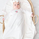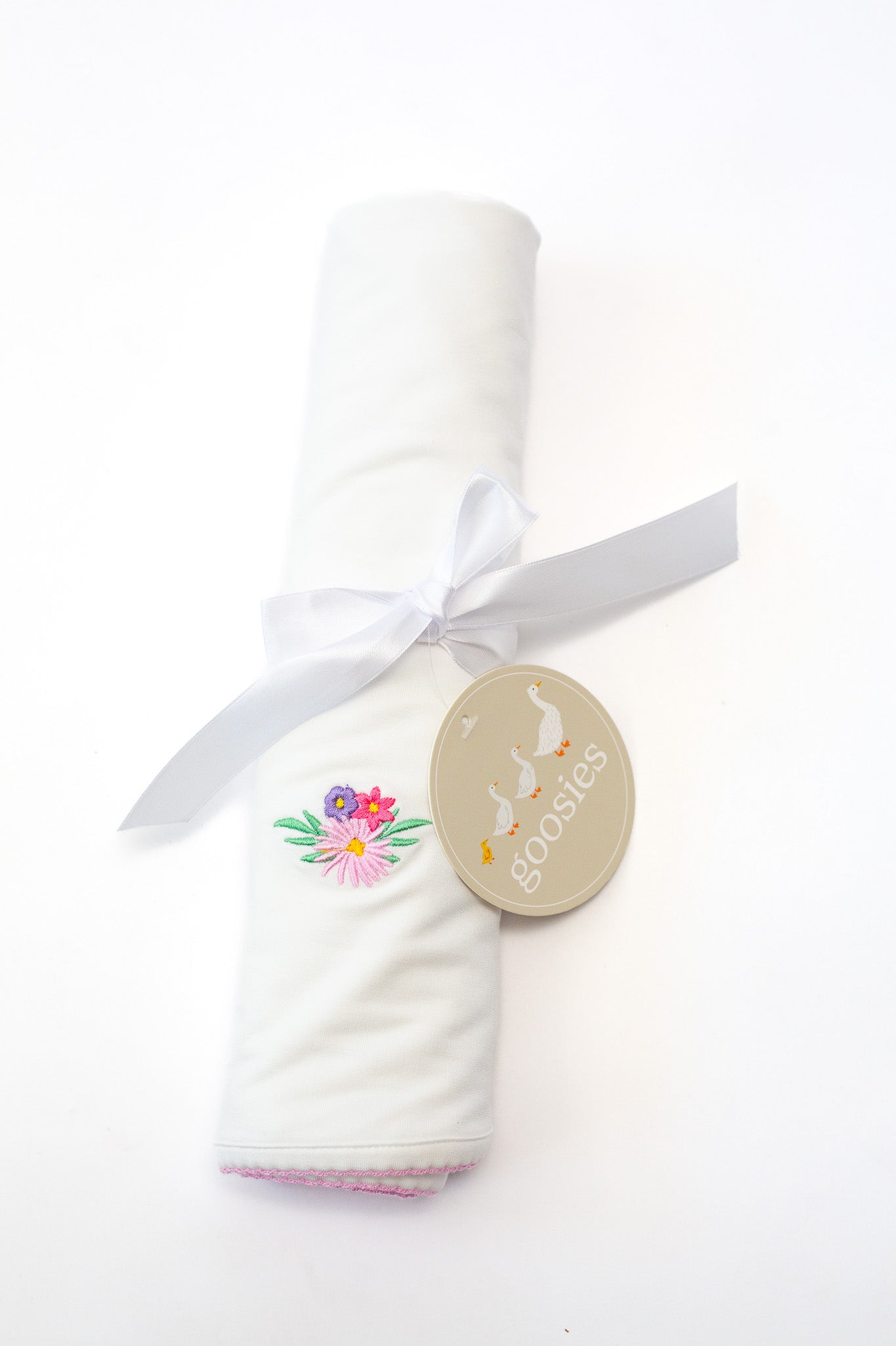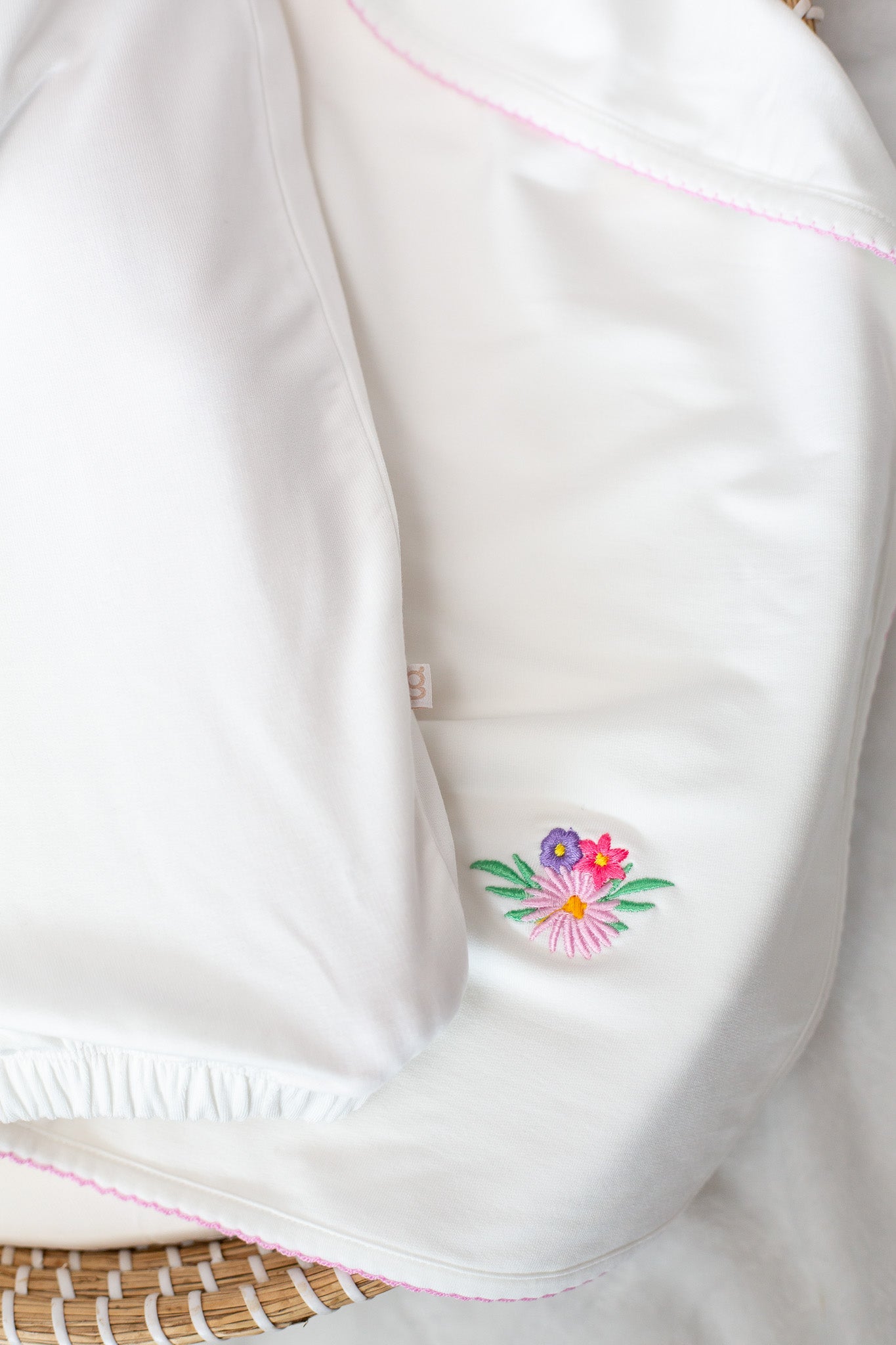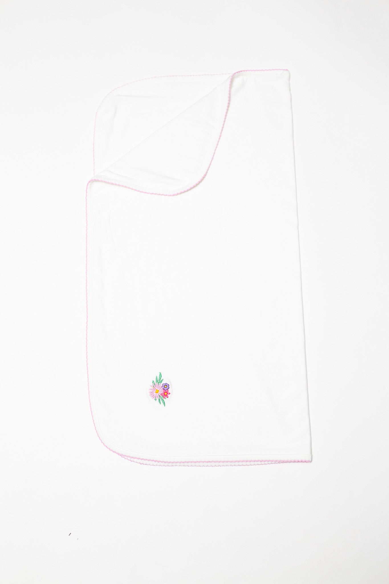 Soft, timeless, and made for the sweetest beginnings 🤍 This beautifully crafted blanket features a delicate embroidered detail, adding a gentle heirloom touch to an everyday essential. Finished with subtle picot trim and tied with a soft ribbon, it’s as giftable as it is practical.