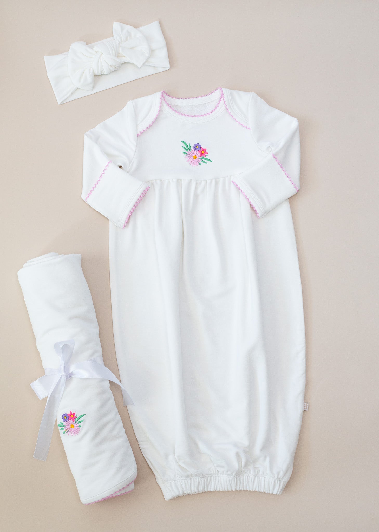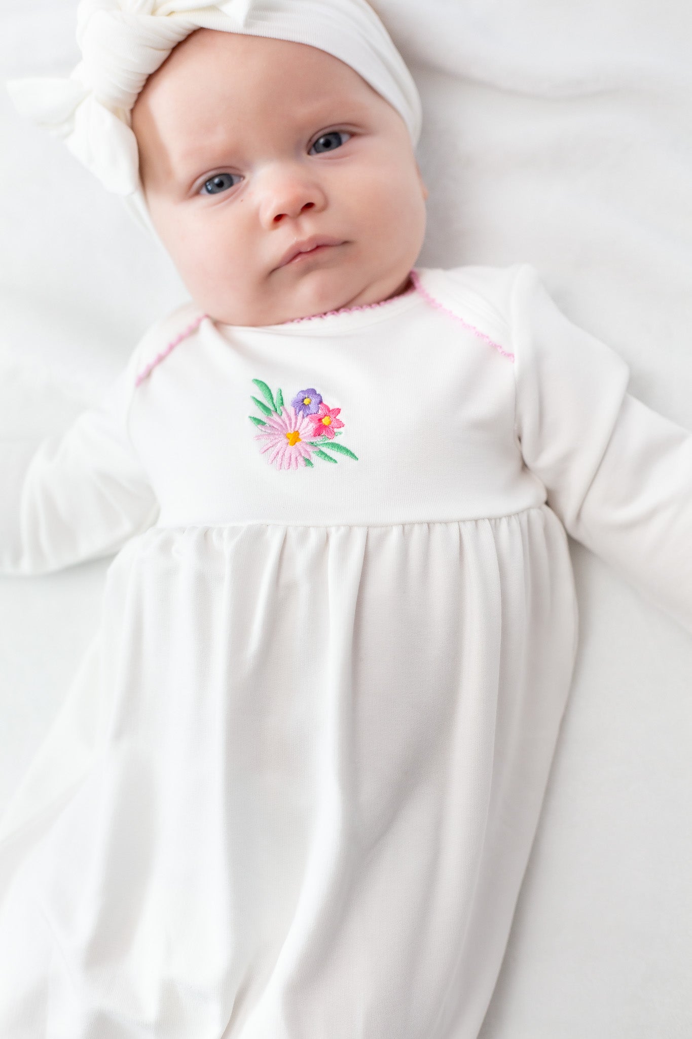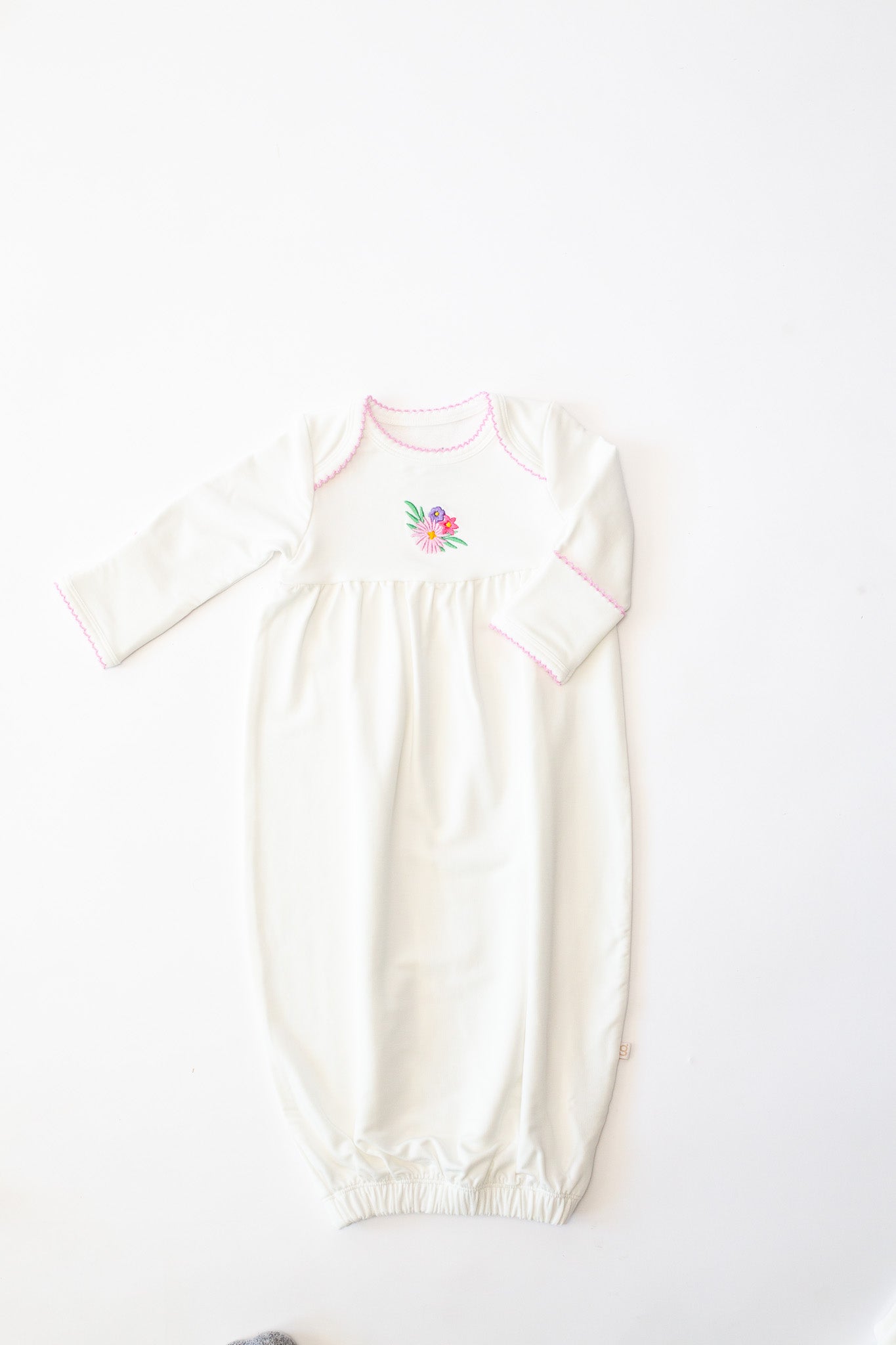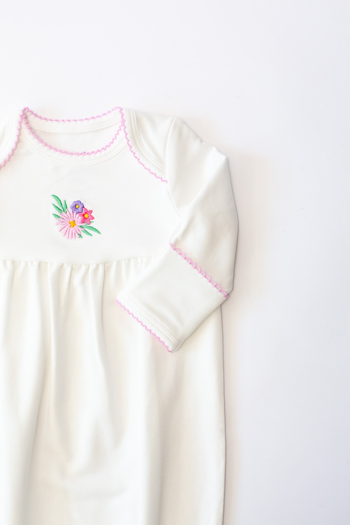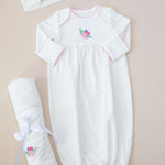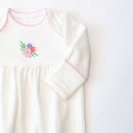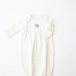 The gown features delicate picot trim along the neckline and scratch mitts for a subtle pop of color and timeless detail. Our exclusive embroidered icons add a playful, heirloom-inspired touch. The gathered yoke creates a relaxed, roomy fit, while the elasticized bottom allows for quick and easy diaper changes—perfect for busy parents and sleepy snuggles.