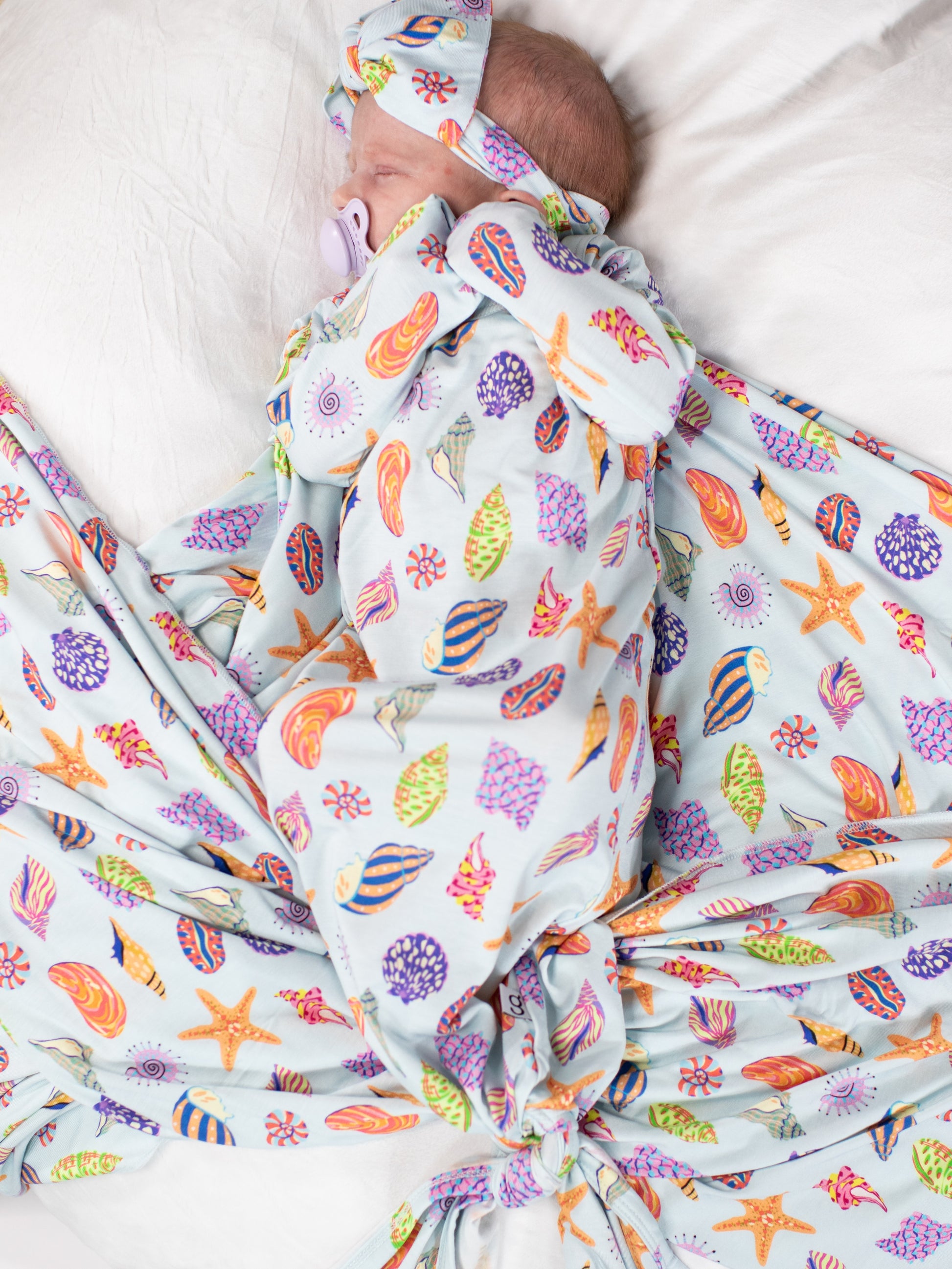 Knotted infant gown with foldable scratch mitts in 0-3 months.
