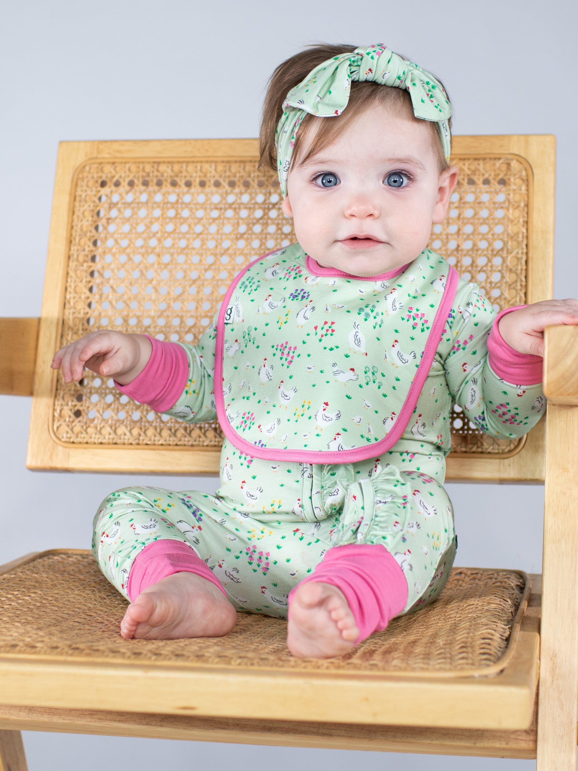 Our Zip Pajamas (with ruffles) feature a two way zipper for easy diaper changes, convertible feet and scratch mitts for sizes 0-3 months and 3-6 months.